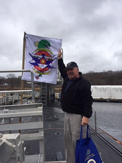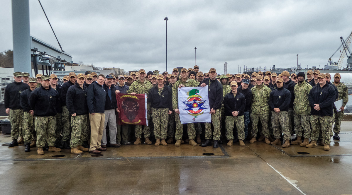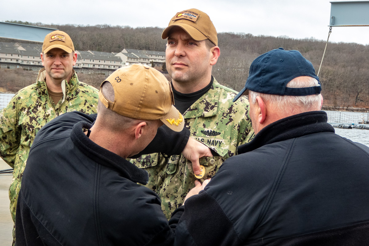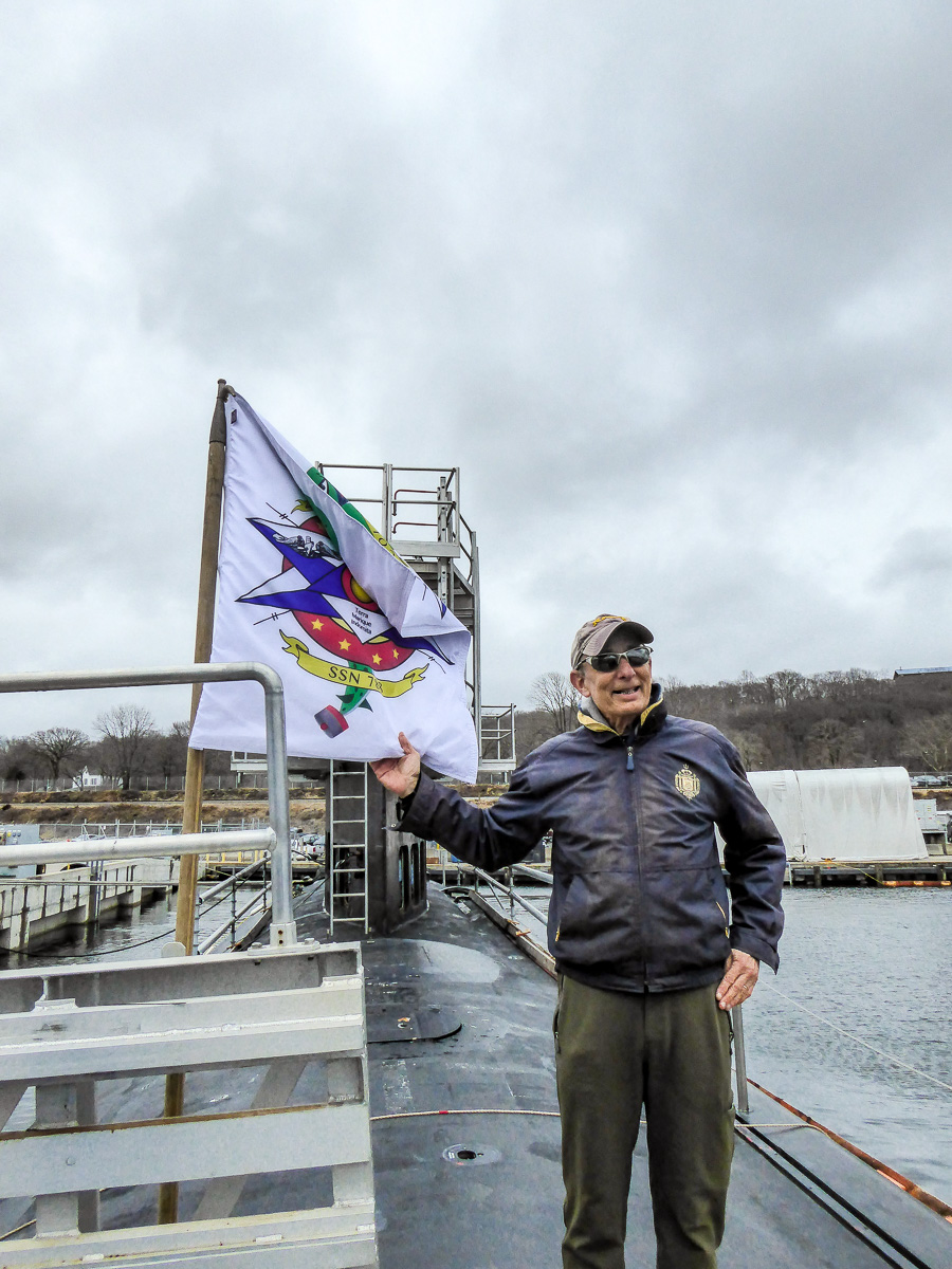During the visit the Association members presented a special “battle flag” to the crew that they will display while in port and transiting on the surface. They were able to make the presentation during a crew assembly on the pier where a number of crew members received awards for superior performance. It was great to see many of the crew members who made trips to the state during the construction phase. The Association intends to continue those visits in the future, but with the ship now operating, the visits will not be as frequent. Association member Rick Riessen also brought along a number of goodies, such as coffee cups and t-shirts. Rick helped start a new tradition by arranging to have the Command Master Chief insignia worn by a previously served Chief of the Boat “passed down the line” and given to the current COB Chip Alger in a surprise presentation. The intent is to have this pin passed down from COB to COB on Colorado.