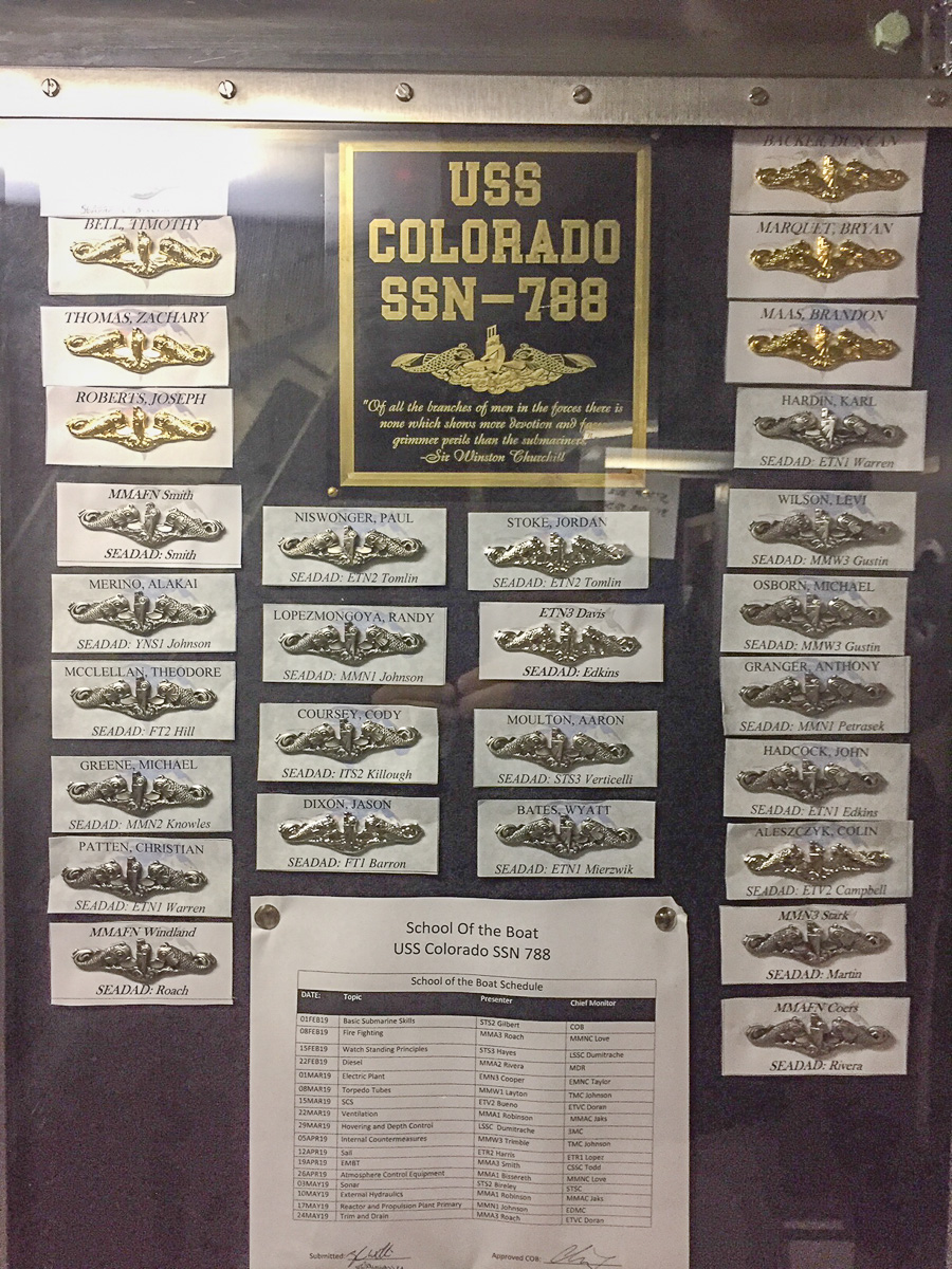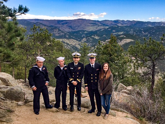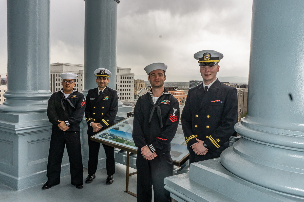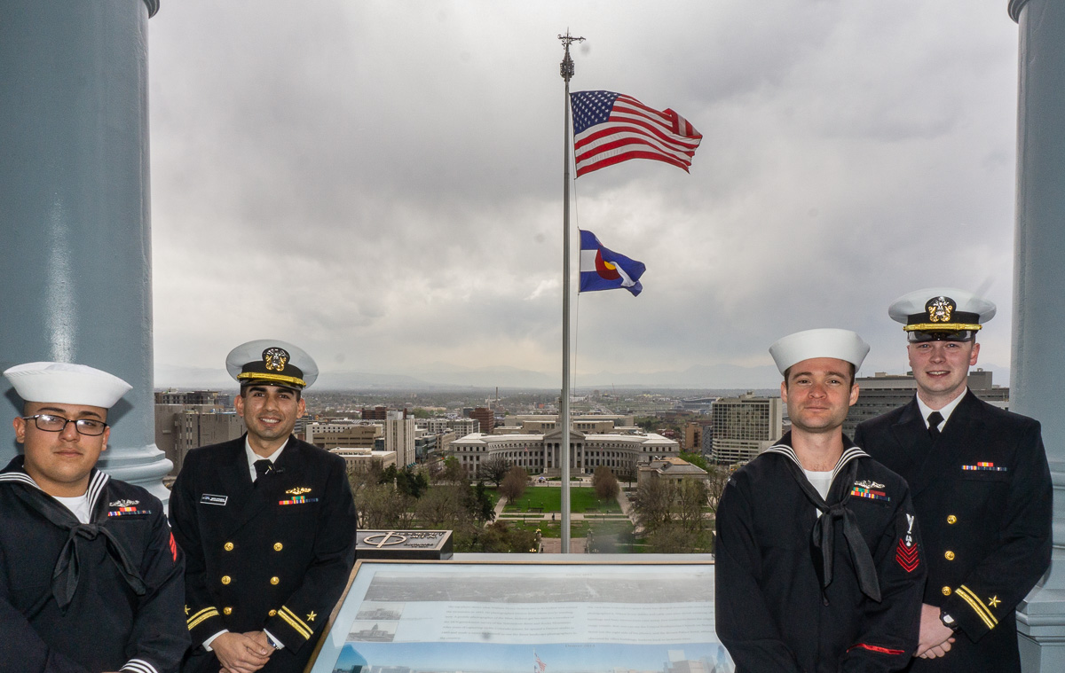 On Saturday May 4th, Lieutenant Junior Grade (LTJG) Anthony Matus, LTJG Timothy Bell, Machinist’s Mate First Class (MMN1(SS)) Chris Guitierrez and Fireman (FN(SS)) Albert Rodriquez arrived in Denver for a four day visit to our state. LTJG Matus, the Assistant Operations Officer, had actually been on a previous crew visit in October of 2017. LTJG Bell has been on board about eight months and is currently the Chemistry and Radiological Assistant. MMN1(SS) Guitierrez is a nuclear machinist mate and hold the distinction of being the longest serving member of the crew having reported with the first increment of the engineering department in 2014. FN(SS) Rodriquez, a member of Auxiliary Division, completed the requirements for submarine qualification in only six months, one of the shortest times of any of the crew.