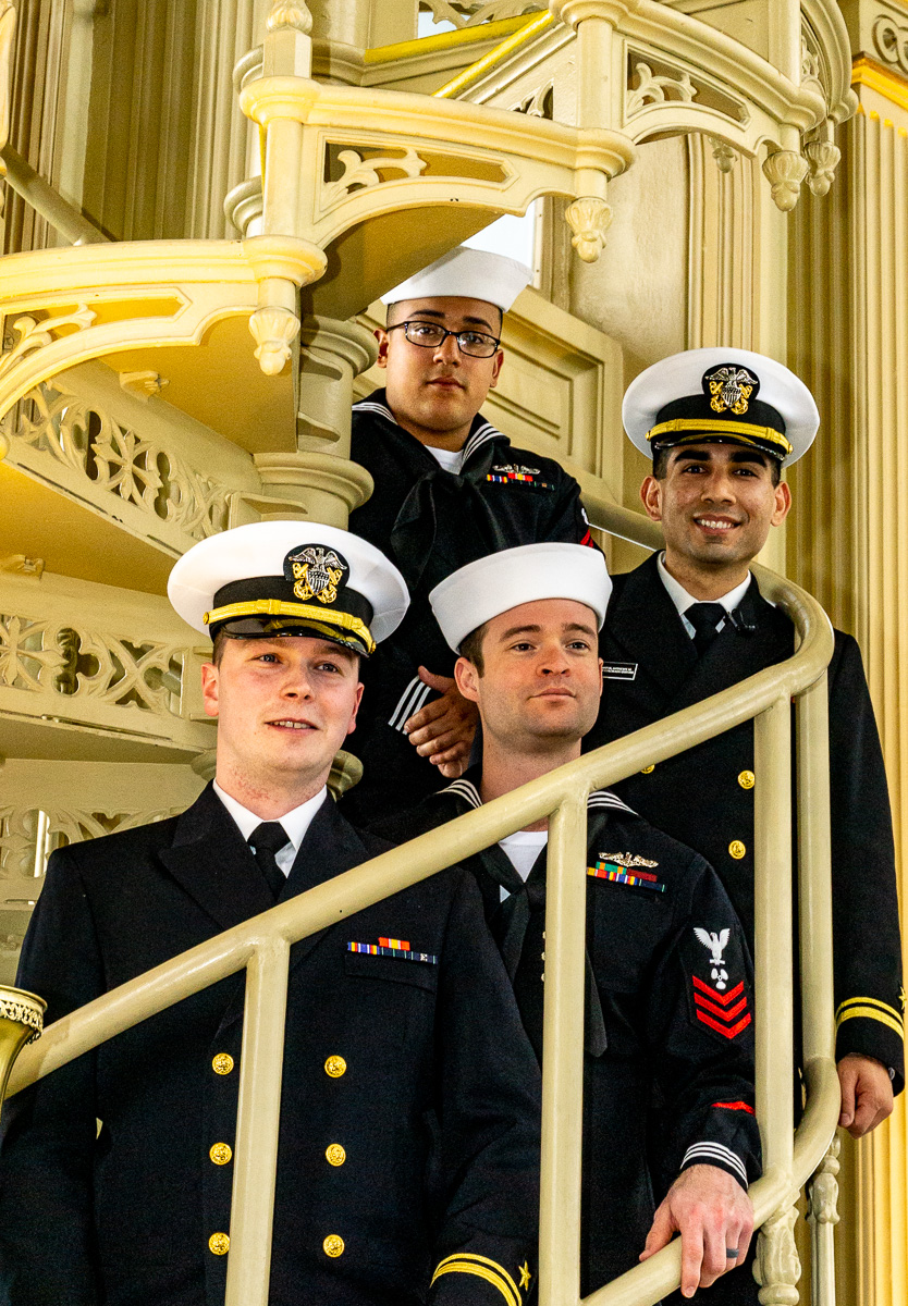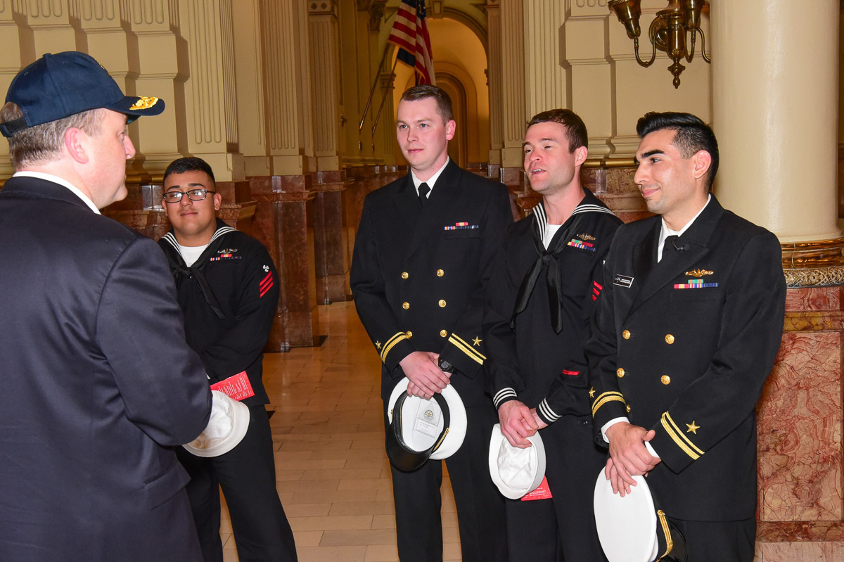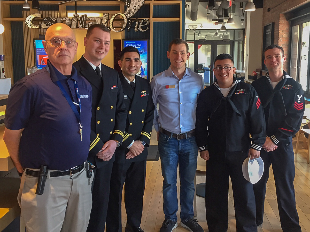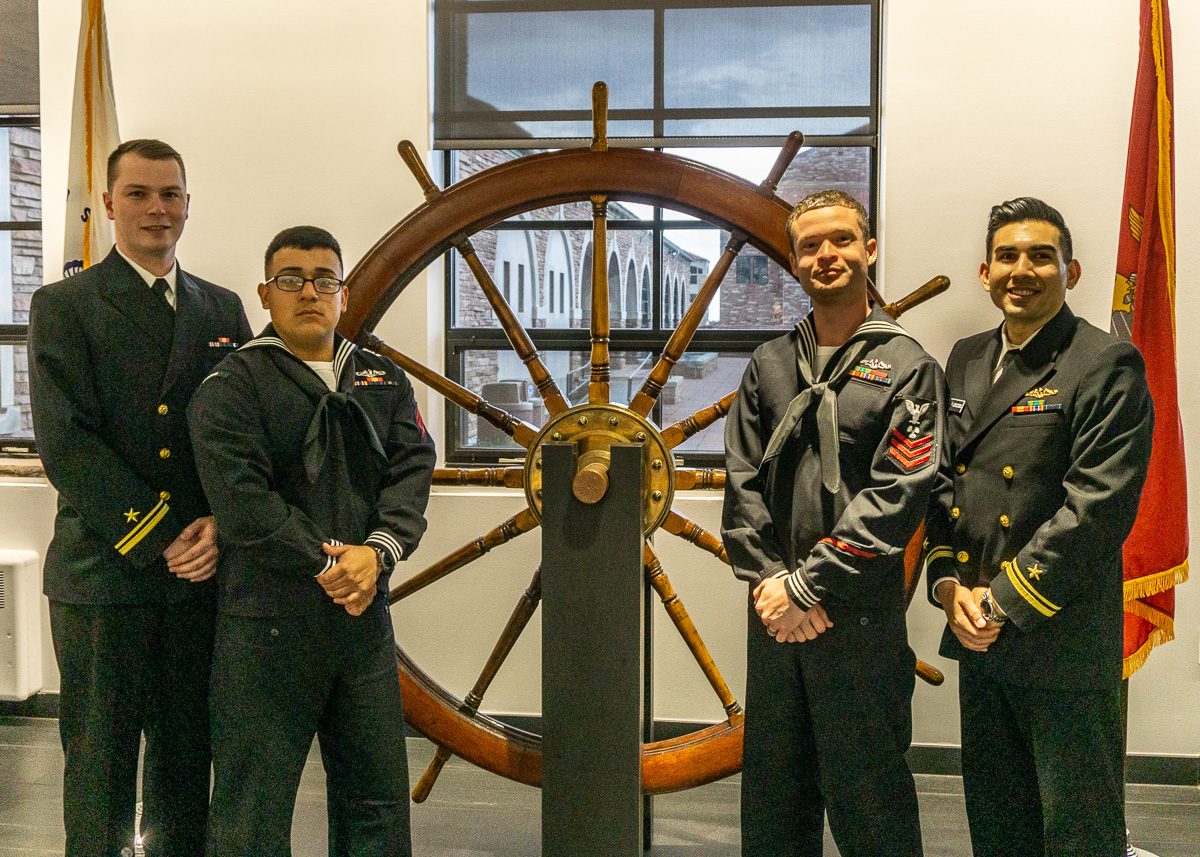 On Saturday May 4th, Lieutenant Junior Grade (LTJG) Anthony Matus, LTJG Timothy Bell, Machinist’s Mate First Class (MMN1(SS)) Chris Guitierrez and Fireman (FN(SS)) Albert Rodriquez arrived in Denver for a four day visit to our state. LTJG Matus, the Assistant Operations Officer, had actually been on a previous crew visit in October of 2017. LTJG Bell has been on board about eight months and is currently the Chemistry and Radiological Assistant. MMN1(SS) Guitierrez is a nuclear machinist mate and hold the distinction of being the longest serving member of the crew having reported with the first increment of the engineering department in 2014. FN(SS) Rodriquez, a member of Auxiliary Division, completed the requirements for submarine qualification in only six months, one of the shortest times of any of the crew.