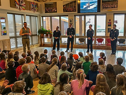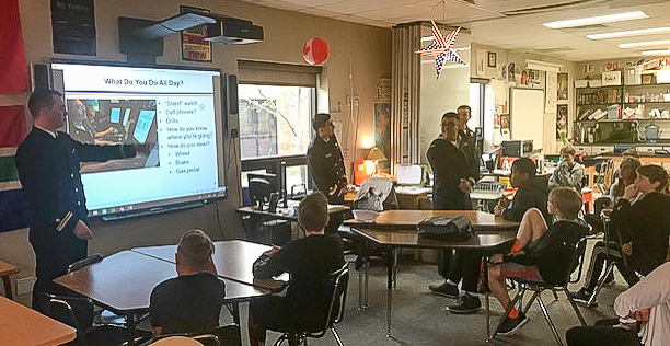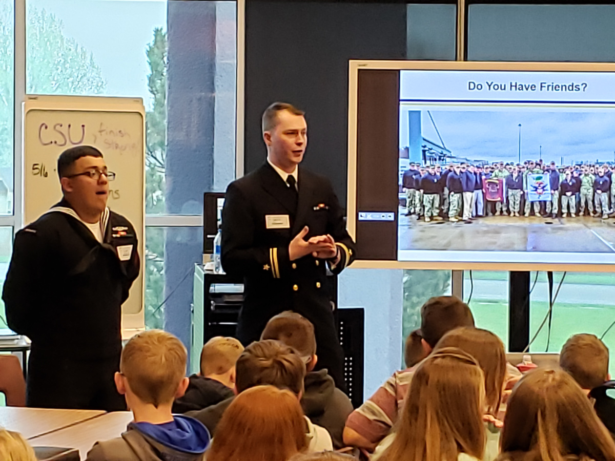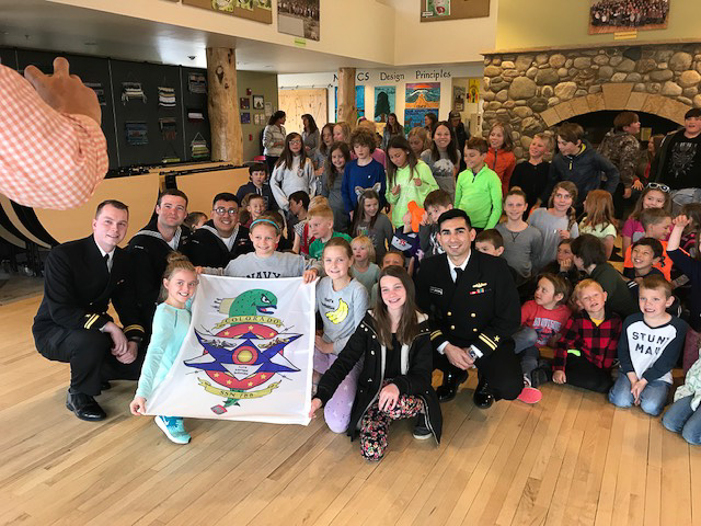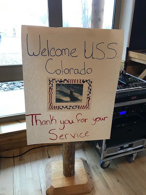 They started Wednesday as guests of Steamboat Springs City Council for breakfast and then gave a presentation to the Council who were intently interested in what the crew had to say. They then visited North Routt Charter School about twenty miles from Steamboat where they talked to about 150 students in grades 3 through 8 of the school. After stopping at Freshies Restaurant in Steamboat for lunch where they were hosted by the owner, they visited Steamboat middle school where they talked to 120 6th and 7th grade students. They also got to tour the town and visit the local rodeo grounds and ski areas. The sailors were then hosted to dinner at the town’s combined VFW/American Legion Post. They were then hosted at Steamboat Whiskey Distillers for after-dinner refreshments by the owner, a former Navy Seal. The visit was covered in the local Steamboat Pilot newspaper and given front page coverage. Considering that Steamboat Springs is a community of only 12,000 they cut a wide swath. They were often stopped on the street by persons recognizing them because of the news coverage and given spontaneous gift donuts by the Owner of Powder Day Donut shop.