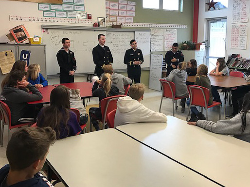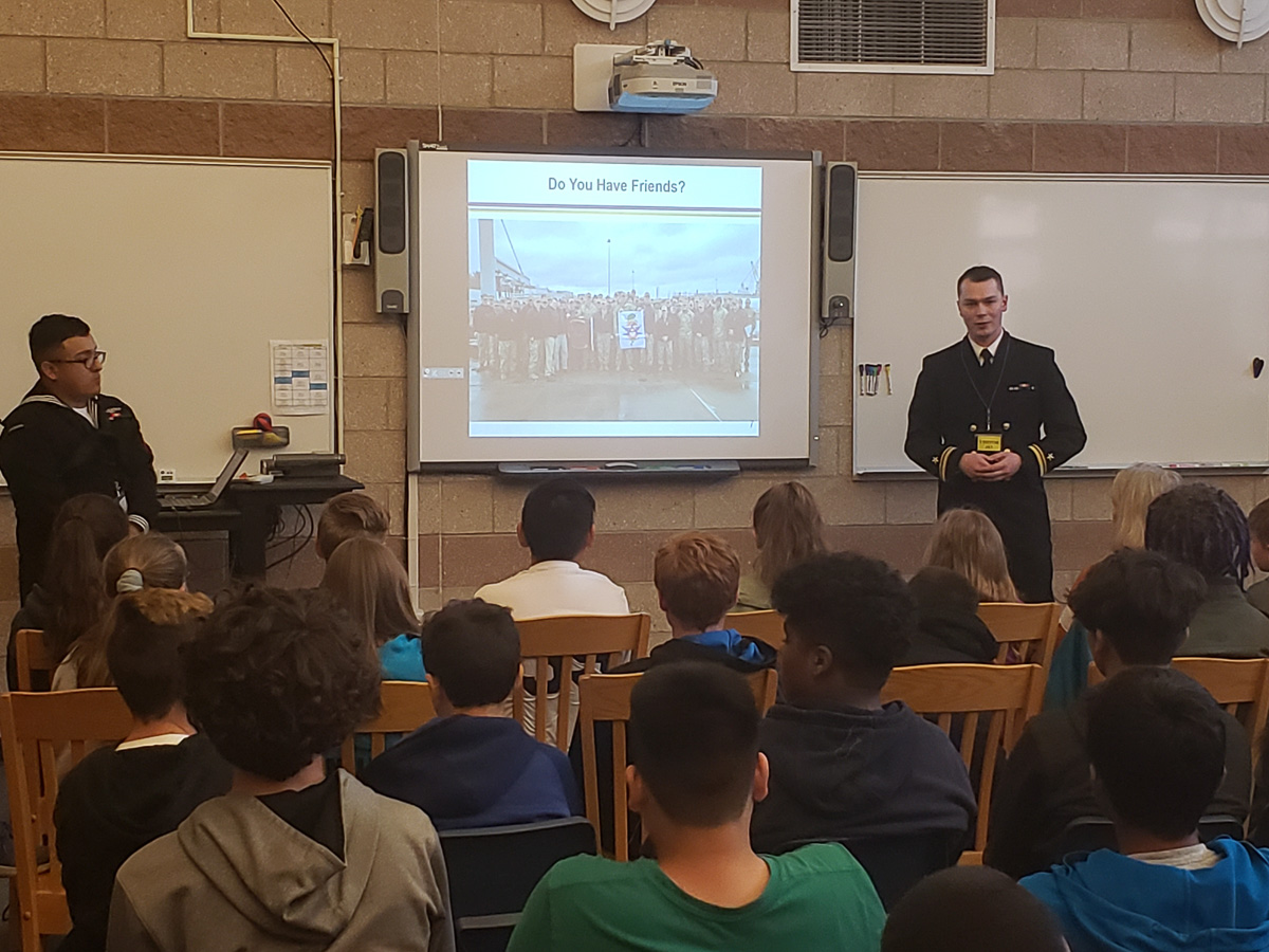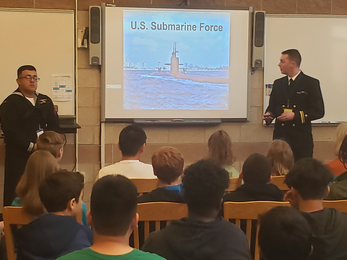 On Tuesday, after driving to Fort Collins, the crew members were interviewed for thirty minutes on local radio station KCOL 600 AM by morning host Jimmy Lakey. They then split up into two groups and set out to visit a total of nine middle and high schools. The schools visited were Preston Middle School, Blevins Middle School, PSD Global Academy, Lesher Middle School, Rocky Mountain High School, PSD Global Academy, Fort Collins High School, Liberty Common High School, and Fort Collins High School. All together they spoke to about 650 students in Fort Collins who asked many questions about life on a submarine. After touring downtown Fort Collins, the sailors headed to Steamboat Springs for their Wednesday events.